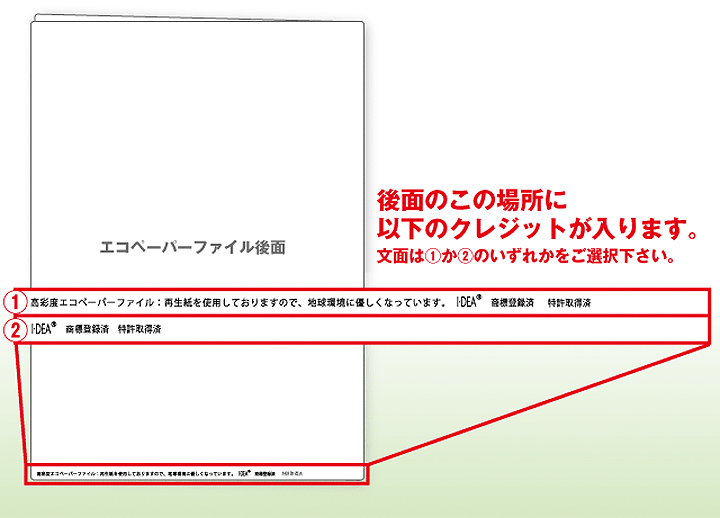 | 注意 | 以下の文言のクレジットが後面下部に入ることをご了承ください。![]() 文面は①か②かいずれかをご選択下さい。 ※ご選択をされない場合は原則として①とさせて頂きます。 ①高彩度エコペーパーファイル:再生紙を使用しておりますので、地球環境に優しくなっています。 商標登録済 特許取得済② 商標登録済 特許取得済 |