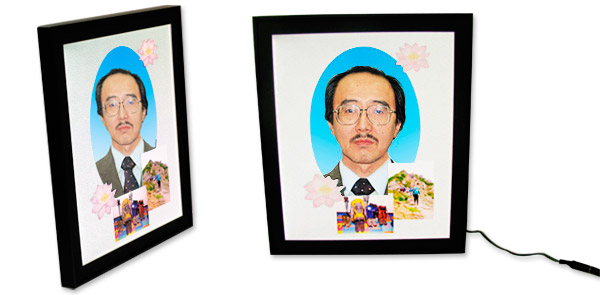 薄型LEDパネルを使用した遺影パネルです。 遺影写真は葬儀中ずっと飾っておくものですから、より遺影写真が映え、故人様の人柄を表すことができます。遺影写真は、アクリル板に直接プリントします。